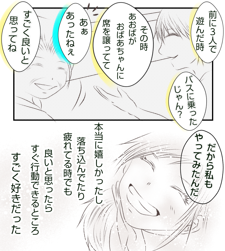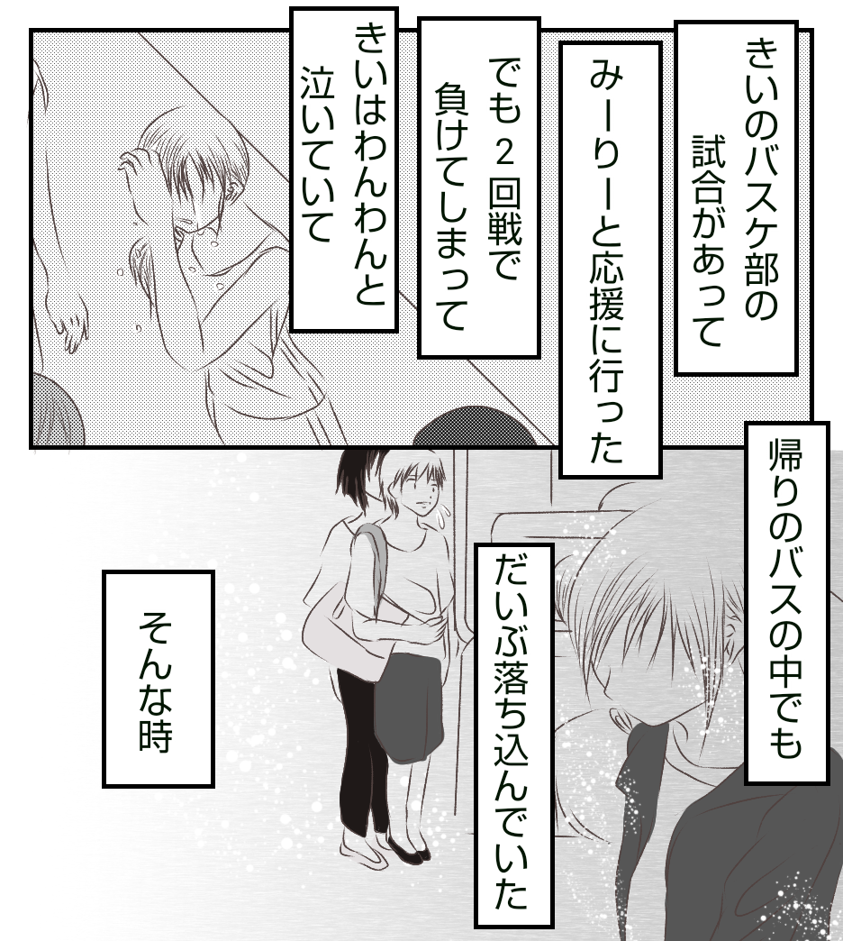 転校生に親友を奪われました~その後~変わらないあいつら④ 2021年11月18日 ご訪問いただきありがとうございます✨前回のお話はこちら↓ 最初から読む↓ 前回はきいの試合帰りのバスの中でのお話でした。それでは続きをどうぞ( ゚∀゚)つこのエピソードはきいとの思い出の中ですごく大切な思い出だったのですが・・・この後ぶち壊されます😂続きます・・・!読んでいただきありがとうございます🥰また読んでもらえたら嬉しいです😃 「転校生に親友を奪われました」カテゴリの最新記事 タグ :#いじめ#イジメ#転校生#仲間外れ#中学生 < 前の記事次の記事 > コメント コメント一覧 (2) 1. そーり 2021年11月18日 14:44 いつも更新楽しみにしています。 とても読みやすく好きな絵です! 末永く読みたいので無理なさらず、お体に気を付けてくださいね!! 0 あおば がしました 2. あおば 2021年11月18日 16:36 >>1 コメントありがとうございます✨ そう言っていただいてとてもとても嬉しいです!🥰 読んでくださる方々にこれからも楽しんでもらえるように頑張り過ぎずに頑張ります✨😊 寒くなってきたので、そーりさんも体調に気をつけてお過ごしください😃 0 あおば がしました コメントフォーム 名前 コメント 記事の評価 リセット リセット 顔 星 情報を記憶 コメントを投稿する