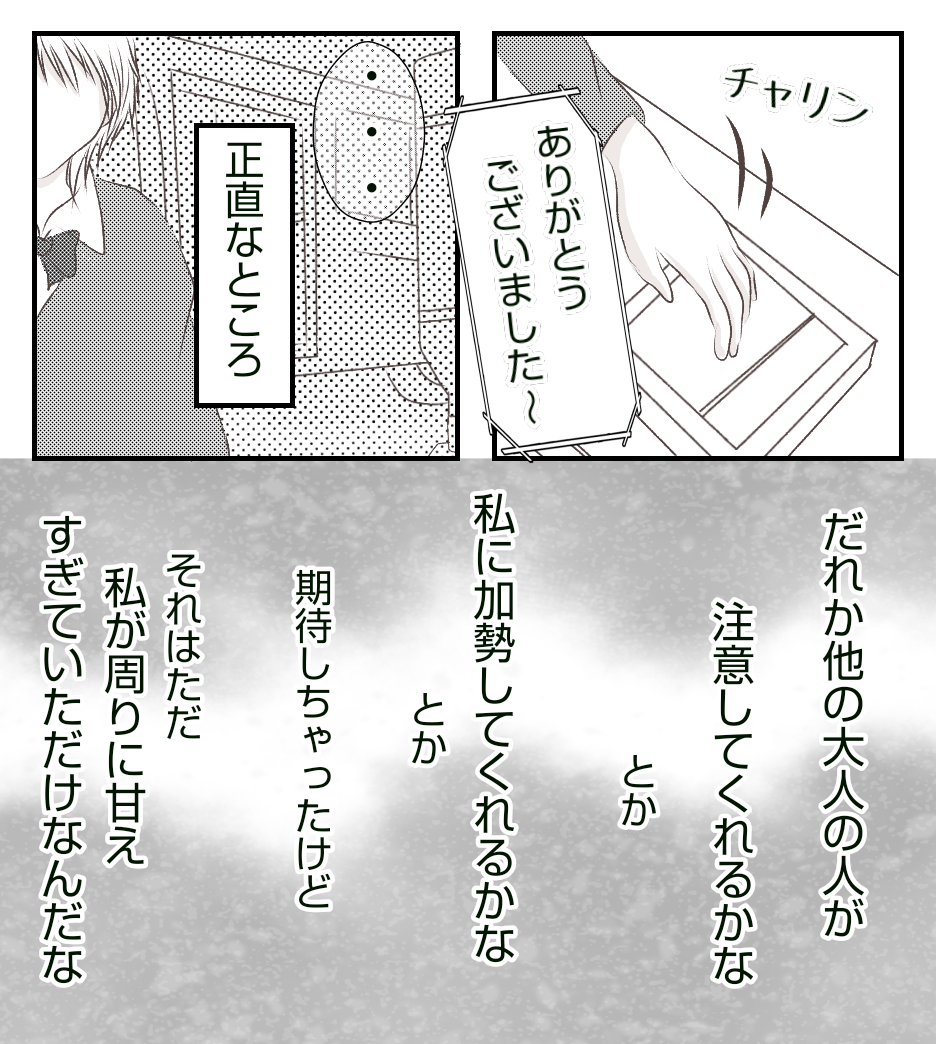 転校生に親友を奪われました~その後~変わらないあいつら⑧ 2021年11月29日 ご訪問いただきありがとうございます✨前回のお話はこちら↓ 最初から読む↓ 一昨日更新分↓ 前回、きい達がバスから降りたあと、誰かに肩をたたかれて・・・それでは続きをどうぞ( ゚∀゚)つこれにてきいのお話は終了です。再会しても和解することはできませんでした。次回は、りんとあかりのお話を少し描きたいと思います。読んでいただきありがとうございます🥰また読んでもらえたら嬉しいです😃次のお話はこちら↓ 「転校生に親友を奪われました」カテゴリの最新記事 タグ :#イジメ#中学生#高校生#仲間外れ#転校生 < 前の記事次の記事 > コメント コメント一覧 (1) 1. 名無し 2023年04月23日 19:50 きいさんアスペルガーっぽくて怖い… 0 あおば がしました コメントフォーム 名前 コメント 記事の評価 リセット リセット 顔 星 情報を記憶 コメントを投稿する