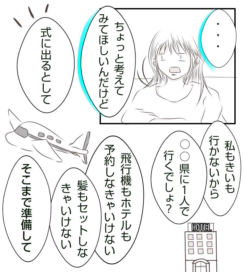 お金の事について、県外の結婚式がダメと言ってる訳ではないのです。県外で行われる『あかり』の結婚式に飛行機代やらホテル代やらご祝儀代といったお金を出せるのか?そこまでしてあげる相手なのか?ということです(中学時代に仲間外れにされたり色々あった相手の結婚式出たくないよね?😭)