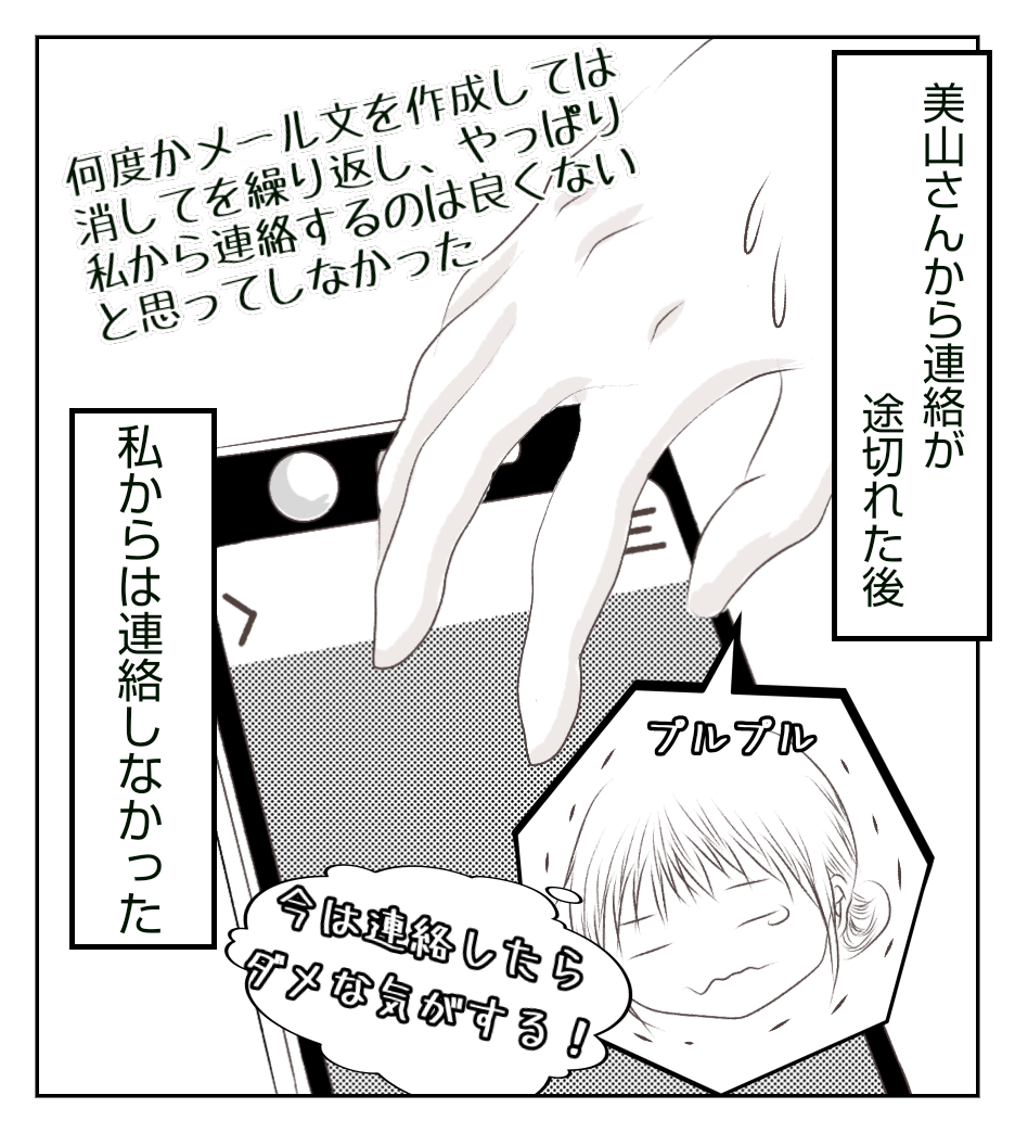 美山さんに連絡を取りたい気持ちを抑えて連絡しませんでした。人間、触れられたくない時もあると思うので・・・