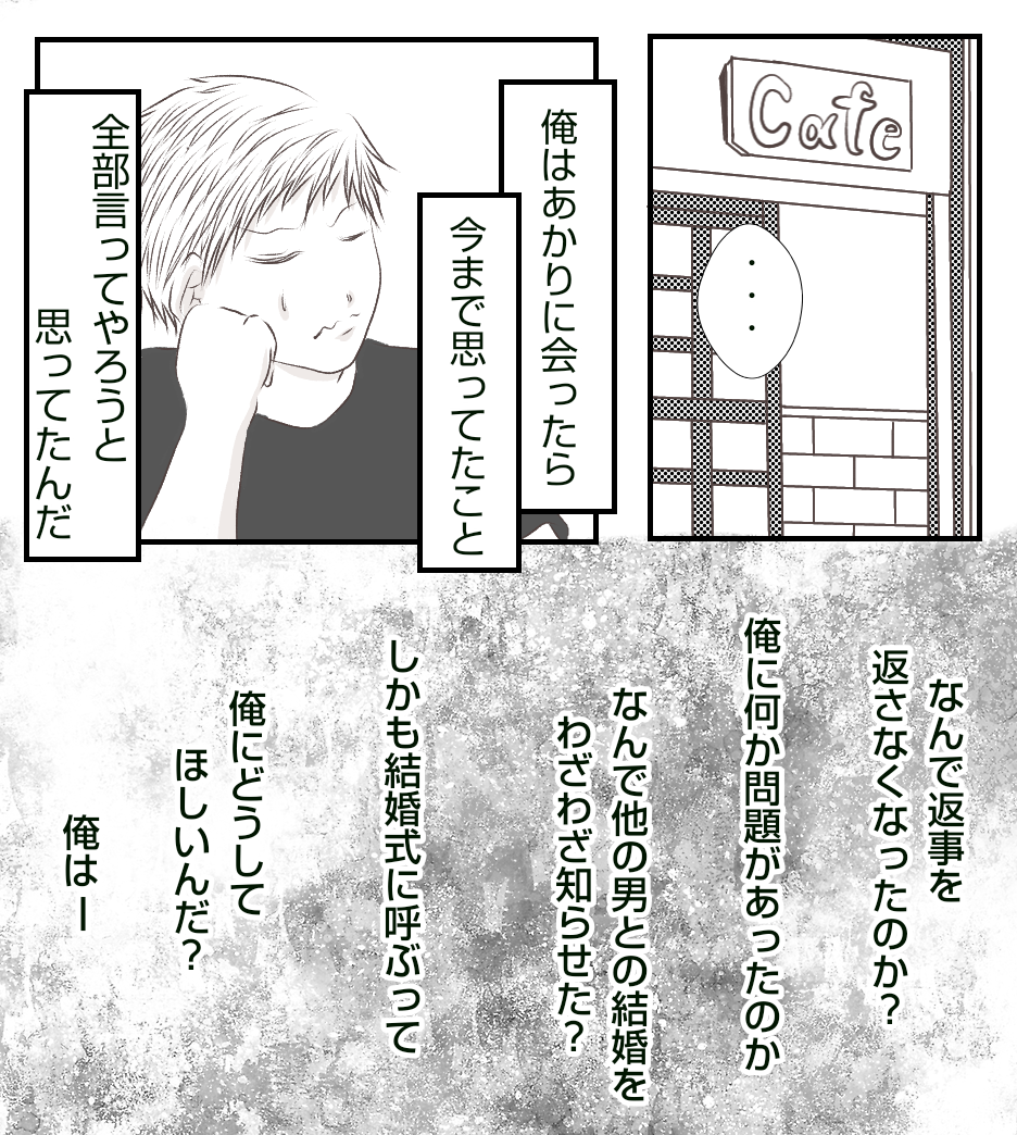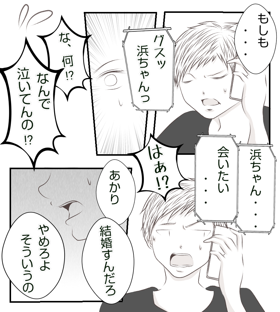 元カレ(仮)を結婚式に呼び、電話で泣き(本当に泣いてたのかな?)、待ち合わせ場所には遅刻してくるというなかなか衝撃的なことをするあかりです・・・