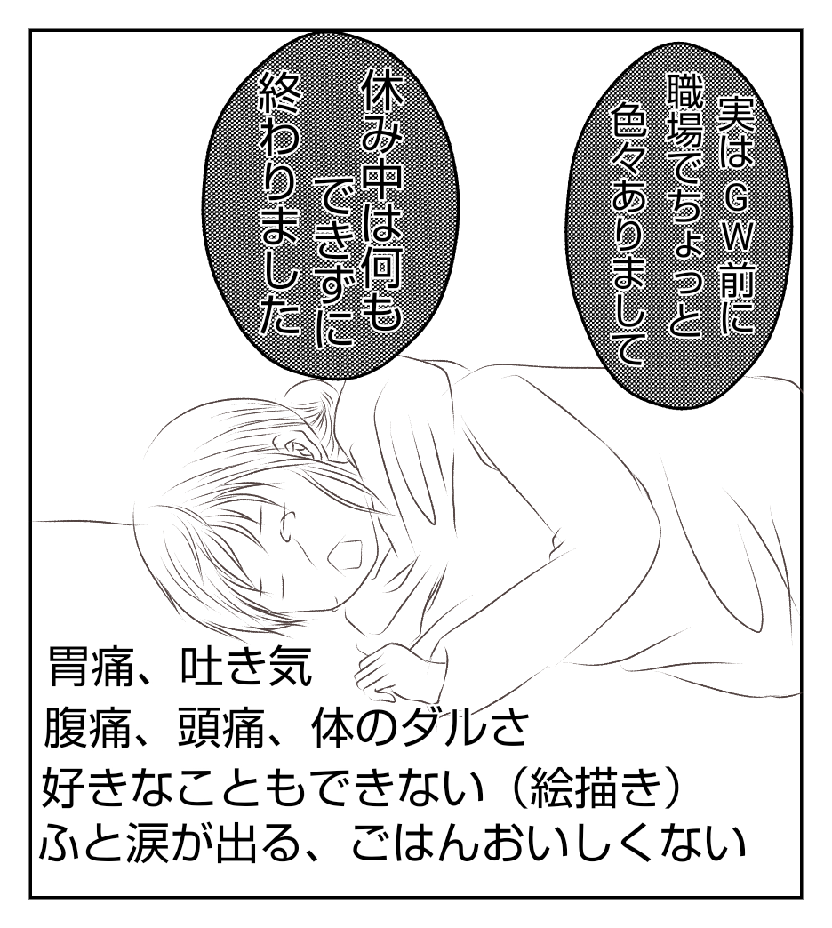 休み中は本当に何食べてもおいしくないし、お腹はキリキリ痛いし、不意に言われたことフラッシュバックして涙出るし、漫画を描くこともできず、本当に辛かったです・・・