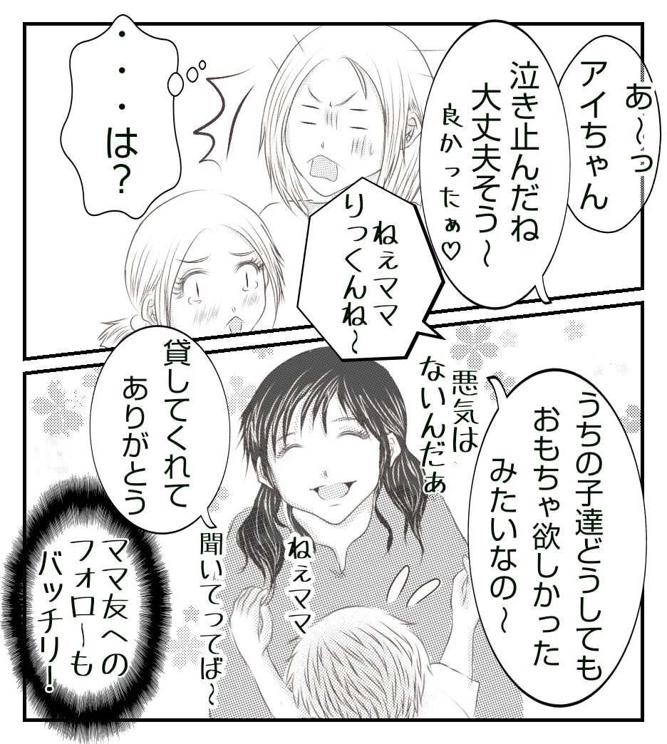前回、児童館を訪れたあさ子と双子達ですが、おもちゃの取り合いが始まって・・・?