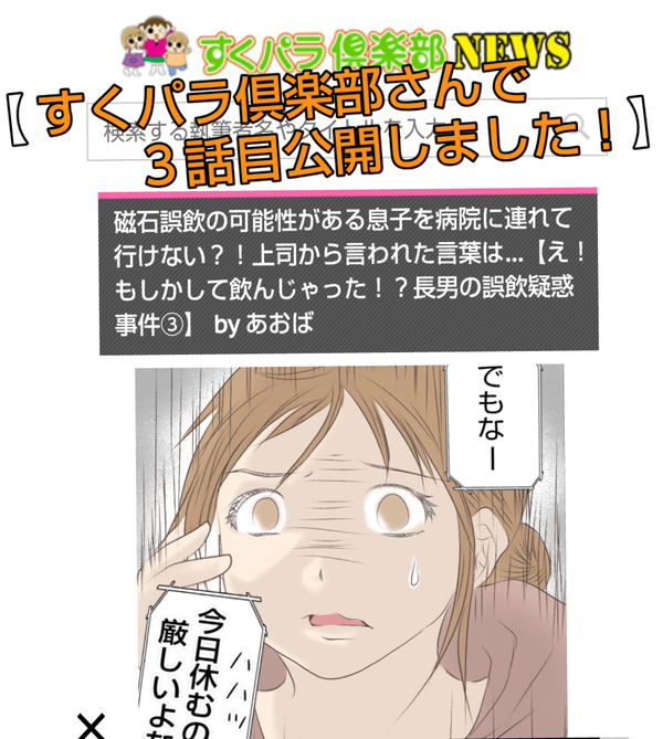 飲んじゃった!?長男の誤飲疑惑事件③【すくパラ更新】 ご訪問いただきありがとうございます✨すくパラ倶楽部さんで連載中のお話の3話目が公開されました!テーマは【しくじり育児】毎日やらかしまくりな私ですが、今回のお話は長男が1歳半の時に起きた誤飲疑惑事件で、色々と後悔した出来事です😭良かったら読んでください( ゚∀゚ ... 続きを読む 2022年05月19日