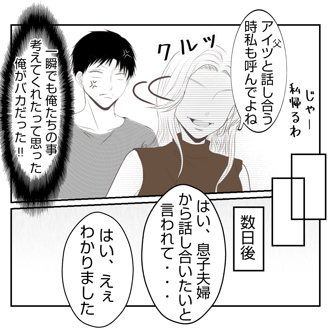 はるかさんは悪いことしてないのに苦労が多くて気の毒だね。戻れるものならペアローン組む前に戻りたいよね。義姉も義母もひどいけど、義父が最悪。