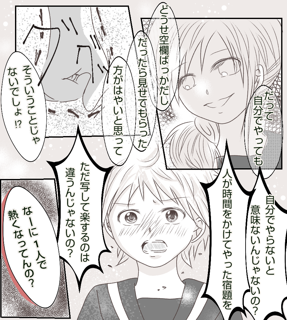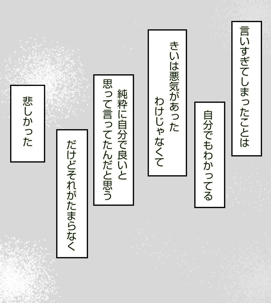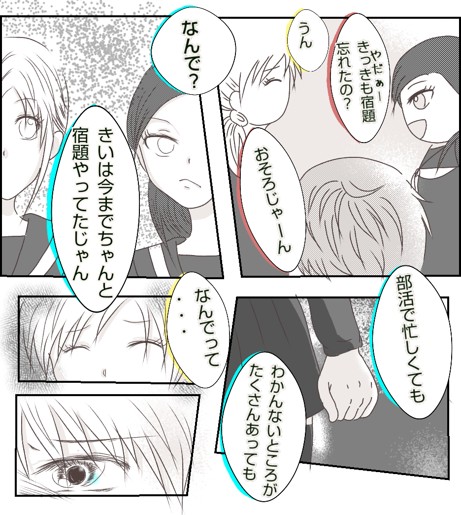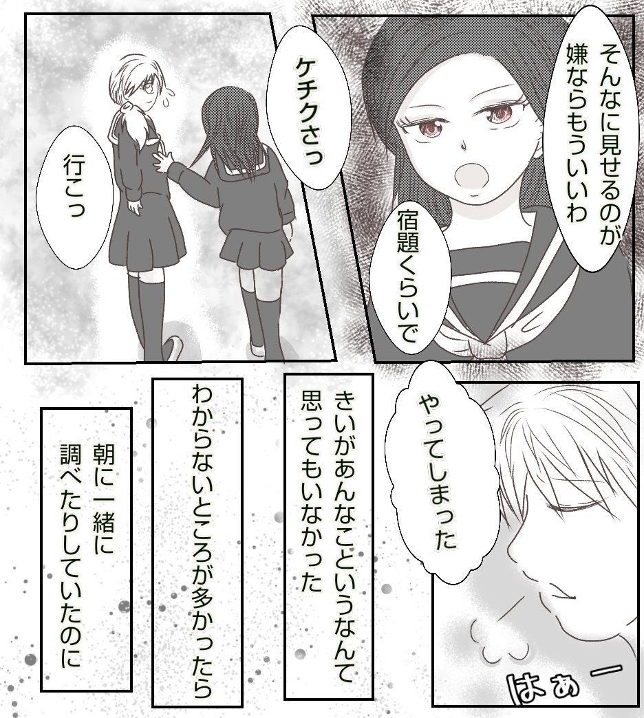 転校生に親友を奪われました【14】 2021年04月08日 ご訪問いただきありがとうございます✨前回のお話はこちら↓ 最初から読む↓ それでは続きです😊 続きます・・・ 正直、宿題とかどうでもよくなってました。きいは私とあかりとのやり取りを目の前で見ていたのに・・・とショックで強い言い方になってしまいました。この時どうしようもなく悲しかったのを覚えています。読んでいただいてありがとうございます🥰また読んでもらえたら嬉しいです😃続きのお話はこちら↓ 「転校生に親友を奪われました」カテゴリの最新記事 タグ :#中学生#転校生#イジメ#仲間ハズレ < 前の記事次の記事 > コメント コメント一覧 (1) 1. 桃田もも 2021年12月28日 13:33 大人目線でも、 言い過ぎなんかじゃない! ・・とは思うけど、学生時代は学生時代の雰囲気やシバリがあるもんですよね・・ きいちゃんはコントロールされてしまったのか?? 不安すぎるけど続きも気になるので読み進めます! 0 あおば がしました コメントフォーム 名前 コメント 記事の評価 リセット リセット 顔 星 情報を記憶 コメントを投稿する